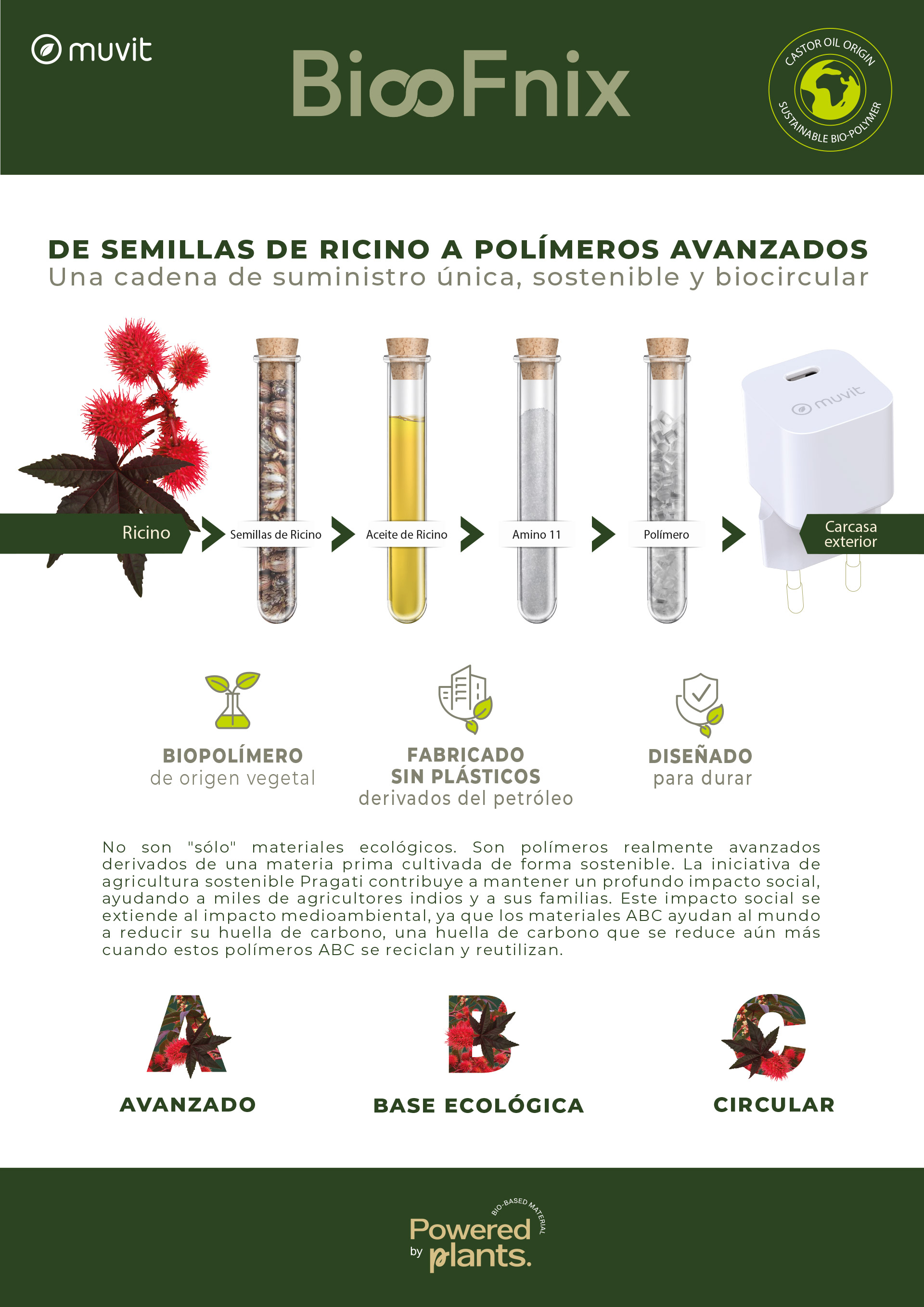 El cargador de pared muvit for change BiooFnix 30W representa una nueva generación de tecnología más respetuosa con el planeta. Fabricado a partir de aceite de ricino transformado en bioresina, este cargador nace literalmente de una semilla, como símbolo de innovación sostenible y compromiso medioambiental.