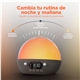Despertador con luz natural y altavoz Bluetooth, ideal para un despertar suave y un sueño reparador. Incluye radio FM, luz de lectura y nocturna, ruido blanco y control por voz con Google Home, Alexa y Siri. Funciona con las apps muvit iO Home y Tuya. Su diseño estético con tejido texturizado y pantalla LED inteligente se adapta a cualquier espacio.